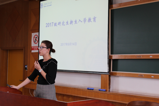 教务办的孙婷老师向新生介绍了公司公司关于研究生教务管理的相关规章制度,建议同学们多关注研究生教育信息管理系统和研究生主页以便及时得到各类通知和信息,同时也希望新生对自己的研究生活有系统的认识和完善的规划。