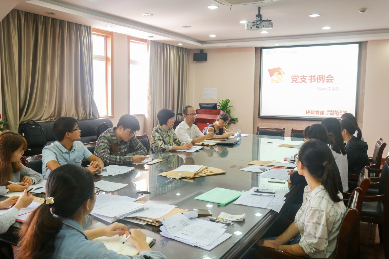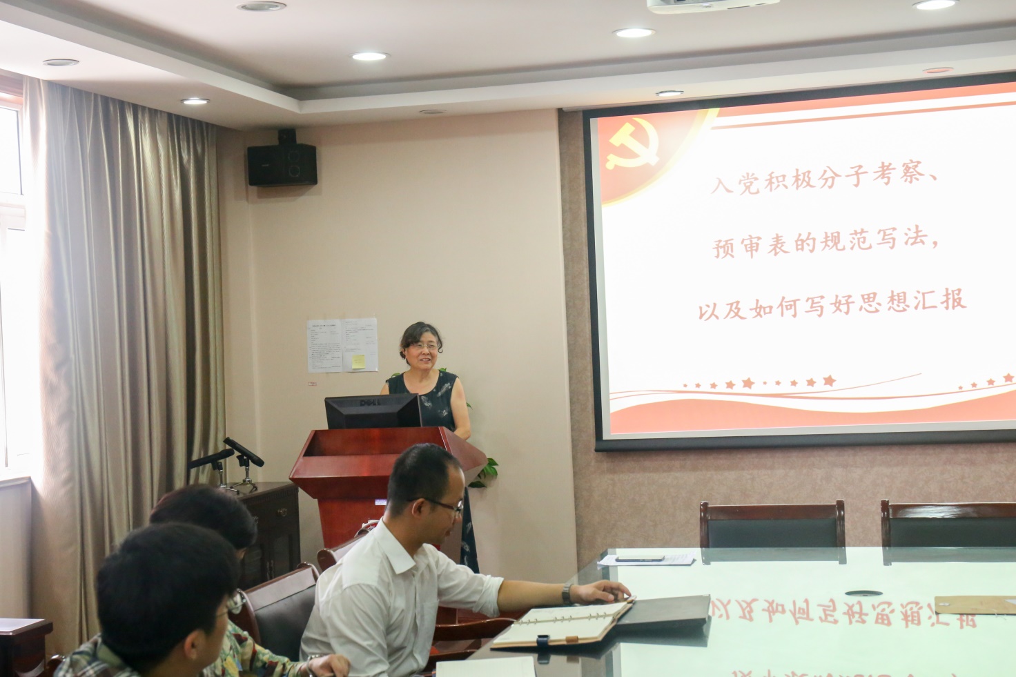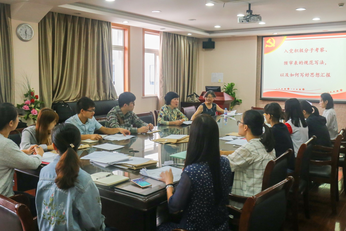 章瑛老师从入党积极分子考察表的规范写法和如何写好思想汇报两个方面对党支书进行了党务培训。在对每项填写内容进行详细说明的同时,她着重强调每一个联系人要实事求是做好对发展对象的考察和记录,这既是对发展对象负责,也是对党组织负责。 随后,李安英老师从严格党员发展标准和程序、健全党员考核机制、加强思想建设等方面进行了工作指导,并对新学期员工党建重点工作进行了布置。
