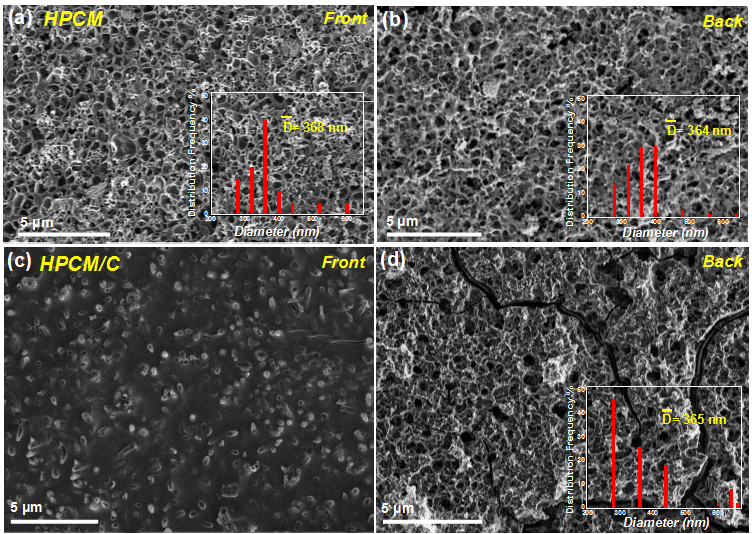 图1. (a,b)导通孔碳膜(HPCM)正反面的扫描电镜图;(c,d)盲孔碳膜(HPCM/C)的正反面扫描电镜图。正面指电池组装时,正对着锂片的碳膜表面。