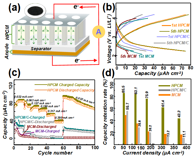 图2. (a)不同大孔结构的碳膜组装锂空气电池示意图;(b) 不同大孔结构碳膜的充放电曲线。(c) 不同大孔结构碳膜的倍率性能。(d) 不同大孔结构碳膜在不同电流密度下的容量保持率。