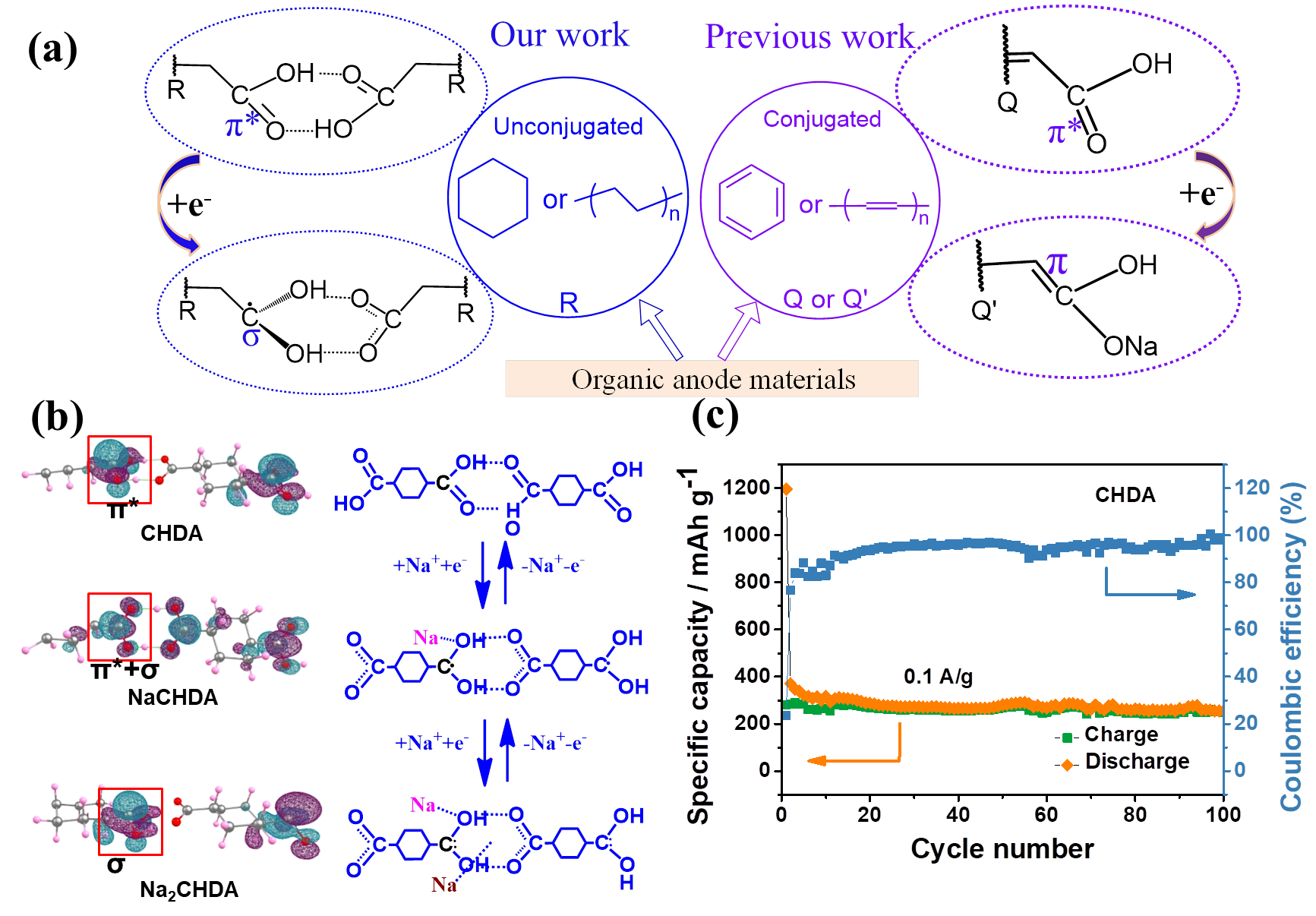 近期,bevictor伟德陈接胜教授、王开学研究员团队与中科院上海硅酸盐研究所刘建军研究员团队合作,在以非共轭体系羧酸类化合物作为钠离子电池负极电极材料方面的研究取得了重要进展。以1,4-环己二羧酸(CHDA)为例,结合实验与理论计算结果,首次提出了非共轭体系羧酸类化合物作为负极电极材料的氢转移储钠机制,即在电化学反应中,两个相邻羧基之间的氢转移会激活羧酸盐官能团的电化学活性,间接促使π*反键轨道向σ成键轨道转变以稳定电子。CHDA负极电极材料具有良好的可逆性和相对恒定的电压。基于以上结果,该工作还对大量非共轭有机化合物进行了预测,为电极材料的选择做出了重要的补充。这项工作将有机电极材料从共轭体系扩展到了非共轭体系,并确定了储钠过程中的氧化还原活性中心,为新型高容量、高可逆性钠离子电池负极材料的开发提供了新思路,为有机电极材料氧化还原反应活性中心的确定提供了新策略。