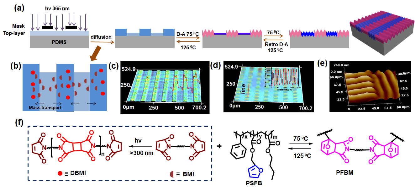 近日,材料领域知名期刊《Advanced Materials》在线发表了bevictor伟德印杰-姜学松课题组在聚合物表面微纳米图案方面的最新研究进展“Hierarchical 3D patterns with dynamic wrinkles produced by a photocontrolled Diels–Alder reaction on the surface”。bevictor伟德博士研究生李甜甜同学是该论文的第一作者,姜学松研究员是该工作的通讯作者。
