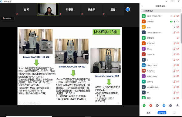 吴节莉老师则重点介绍了公司分析测试中心核磁实验室的仪器特点,在液体核磁、固体核磁和低场核磁方面应用案例和服务特色。校分测核磁实验室配有四台高场,一台低场核磁共振谱仪,五台仪器特点不同,性能互补,在不同的应用领域各自发挥重要作用。通过杂核检测、分子动力学研究、小鼠成像等案例,吴老师生动展示了核磁共振技术在化学、材料及生物科学研究中的应用。最后还介绍了校分测的服务特色,校分测综合液相、固相和成像等多种手段,一对一提出个性化综合解决方案,为师生提供全方位一站式全流程服务。