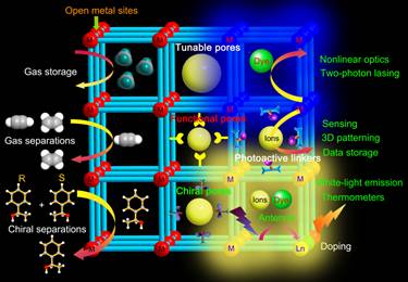 Discoveries of novel multifunctional materials have played very important roles to the development of science and technologies and thus to benefit our daily life. Among the diverse materials, metal–organic framework (MOF) materials are rapidly emerging as a unique type of porous and organic/inorganic hybrid materials which can be simply self-assembled from their corresponding inorganic metal ions/clusters with organic linkers and can be straightforwardly characterized by various analytical methods. They exhibit great potentials for a broad range of applications in gas storage, gas separations, enantioselective separations, photonics, chemical sensing, heterogeneous catalysis, proton conductivity, membrane separations and drug delivery. In this talk, I will highlight our efforts and progress on exploring multifunctional metal-organic frameworks through global collaboration.